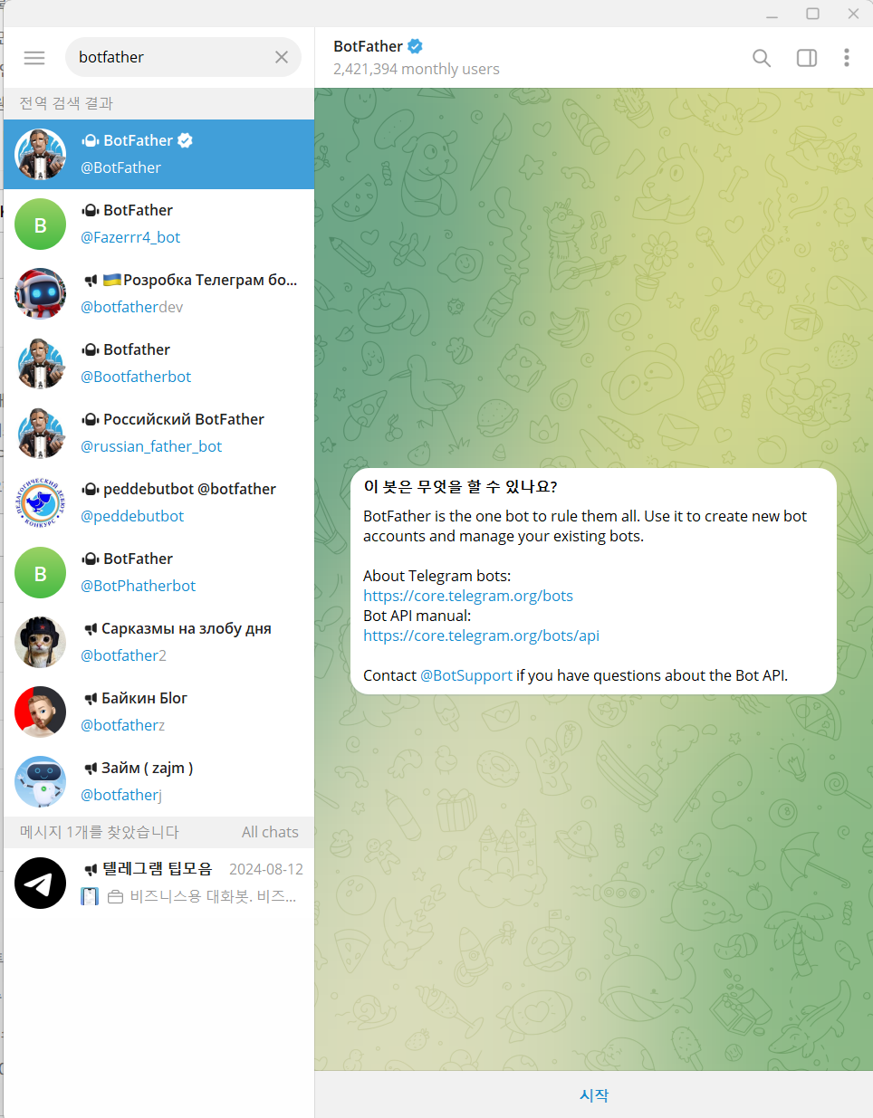 3. 텔레그램 실행후 - > 검색창에 botfather 입력 -> 아래 시작 버튼 누른다.
