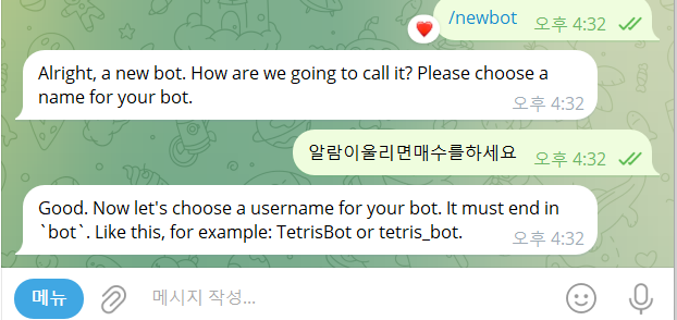 5. 사용할 알람의 이름(한글가능)을 입력 -> 사용한 영문 아이디도 입력해줘야한다. 아이디 뒤에는 _bot 을 써야한다 -> 그다음에 나오는 메시지 박스에서 /help 를 클릭