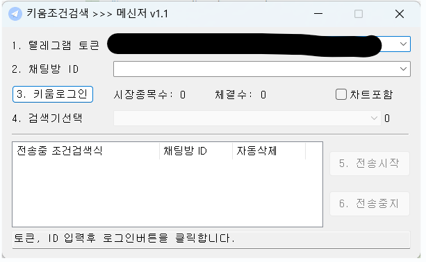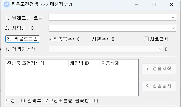 11. 아이디가 생성되면 전체 복사후(숫자 앞에 마이너스까지 복사) --> 2. 채팅방 ID 에 입력 -> 3. 키움로그인 -> 검색기 선택 -> 5. 전송시작 클릭