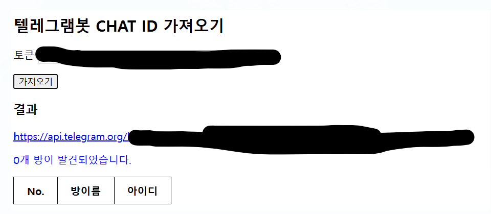 토큰 입력후 - > 가져오기 클릭 -> 아래와 같이 0개의 방이 발견된다고 하면 -> 아까 만든 채팅방에 아무말이나 다시한번 입력후 --> 가져오기 다시 클릭